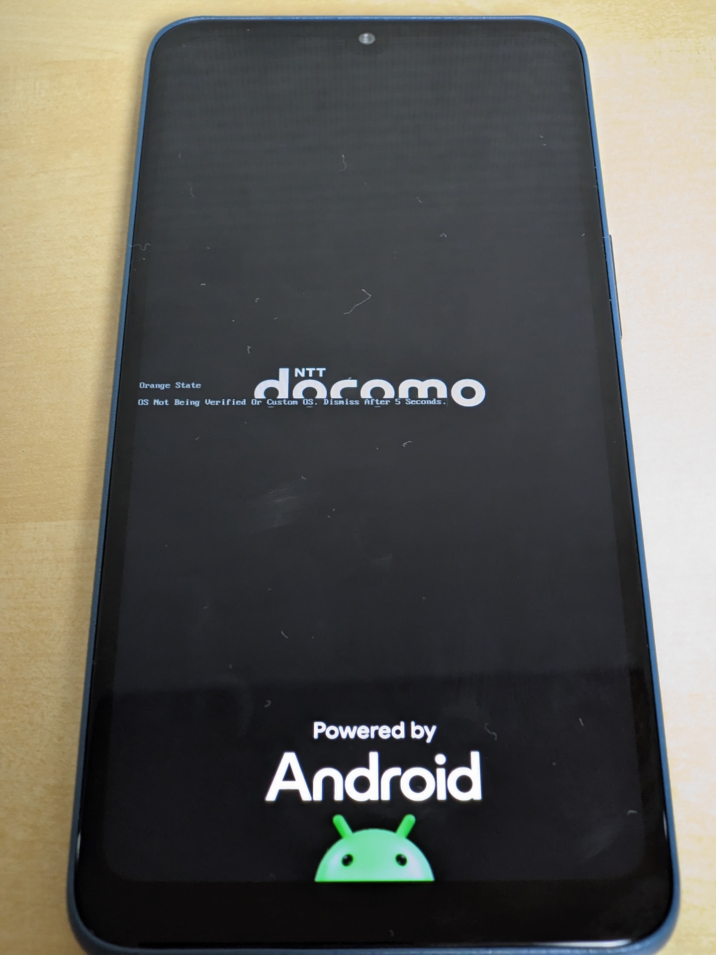 アンロック中の起動画面の警告は以下。ちっちゃい。
