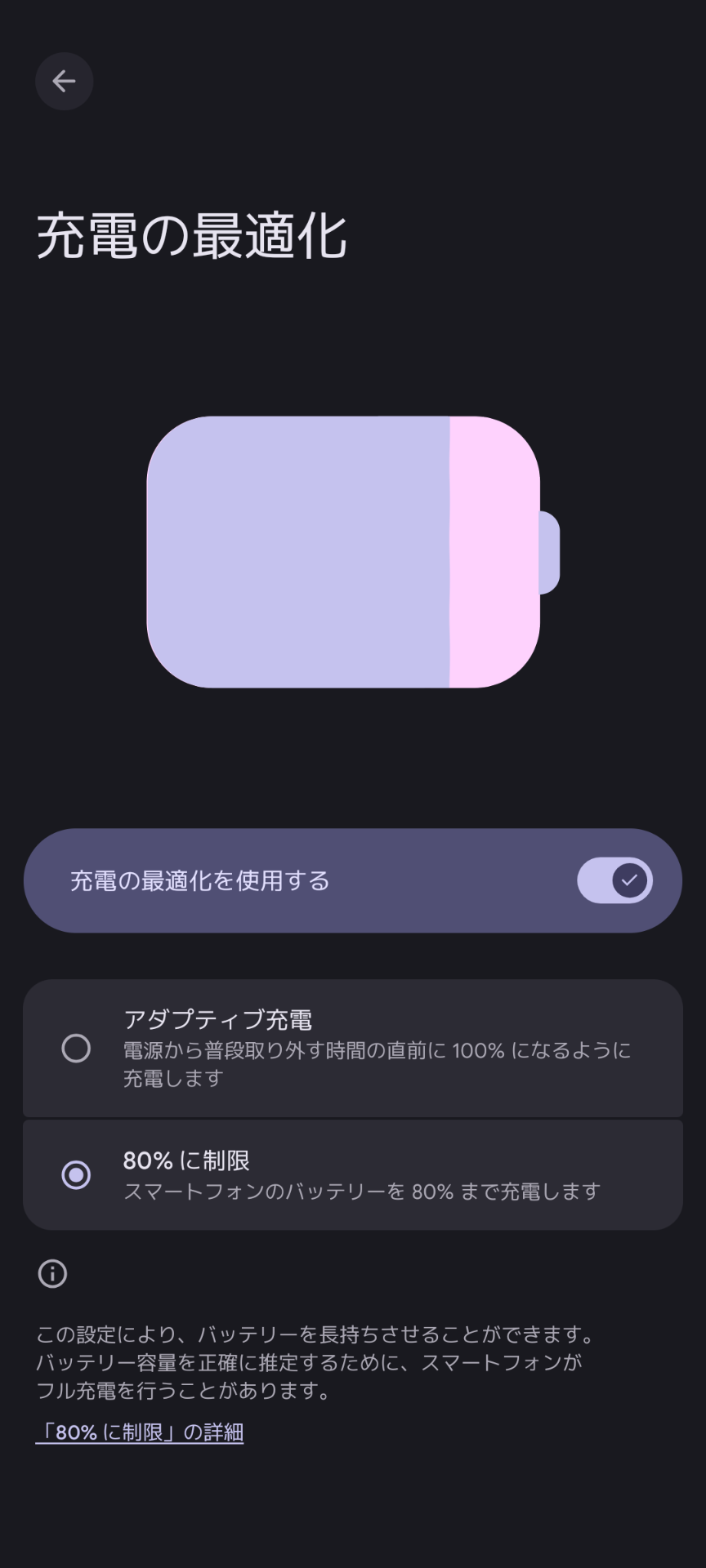 2025/12/18追記: 充電を 80% に制限する機能は6a以降と書かれていたので、Pixel6では非対応なのかと思っていましたが、対応しているみたいでした。